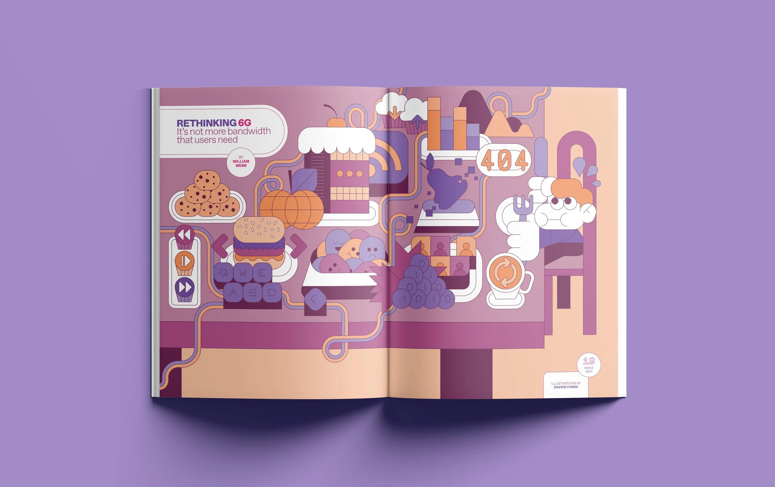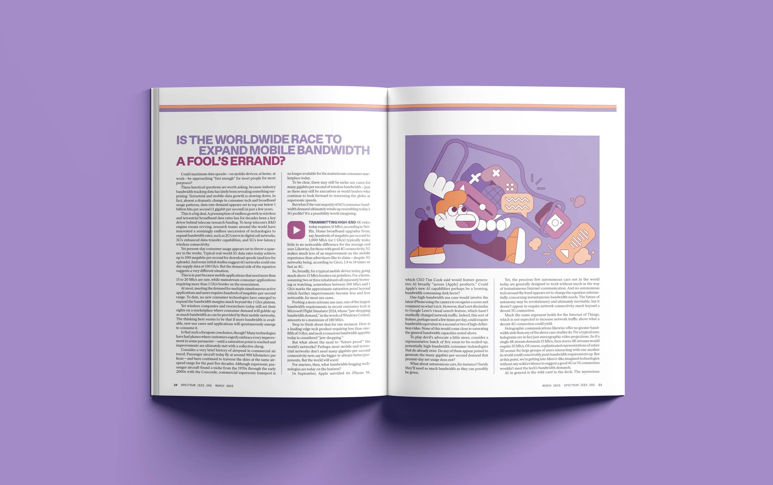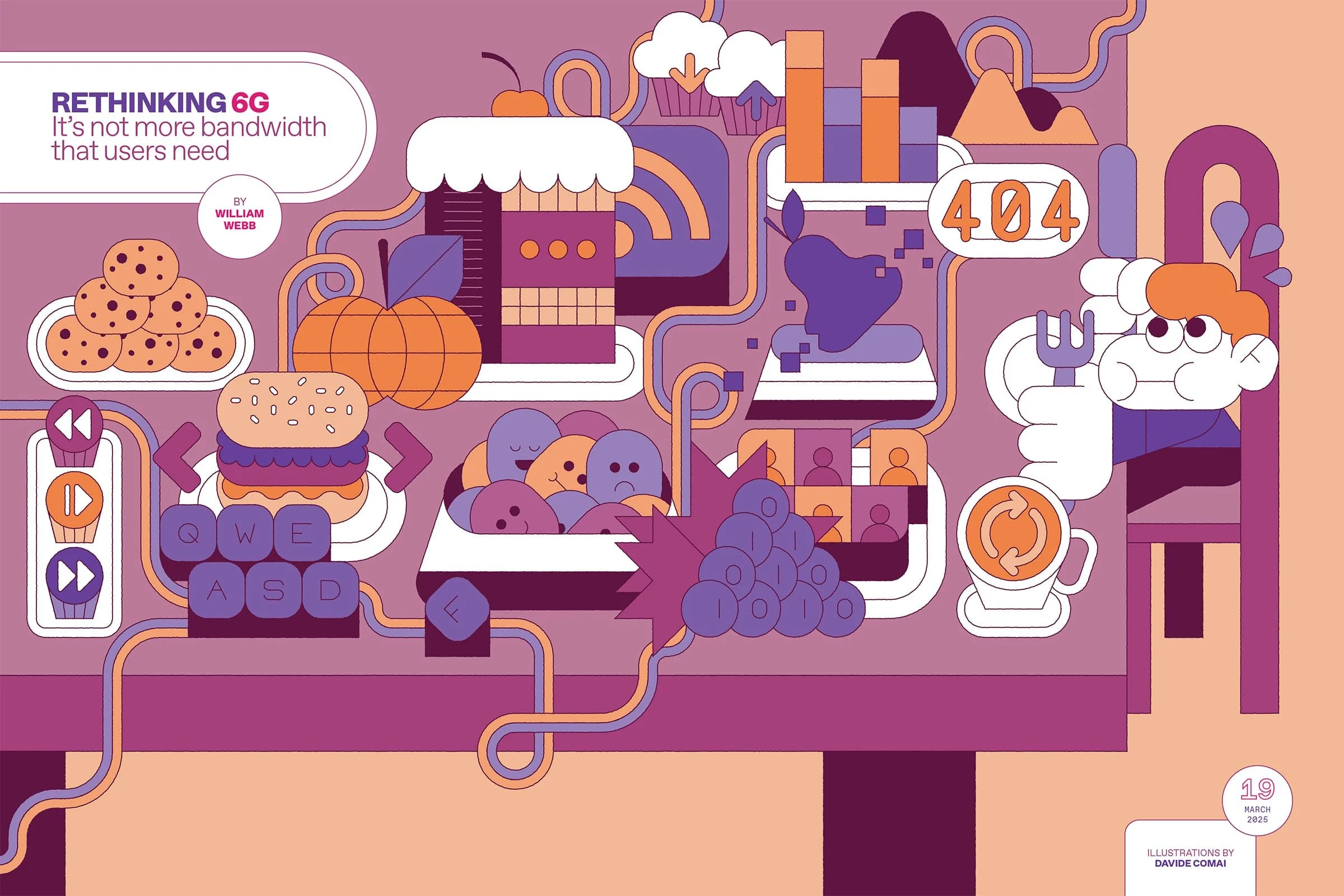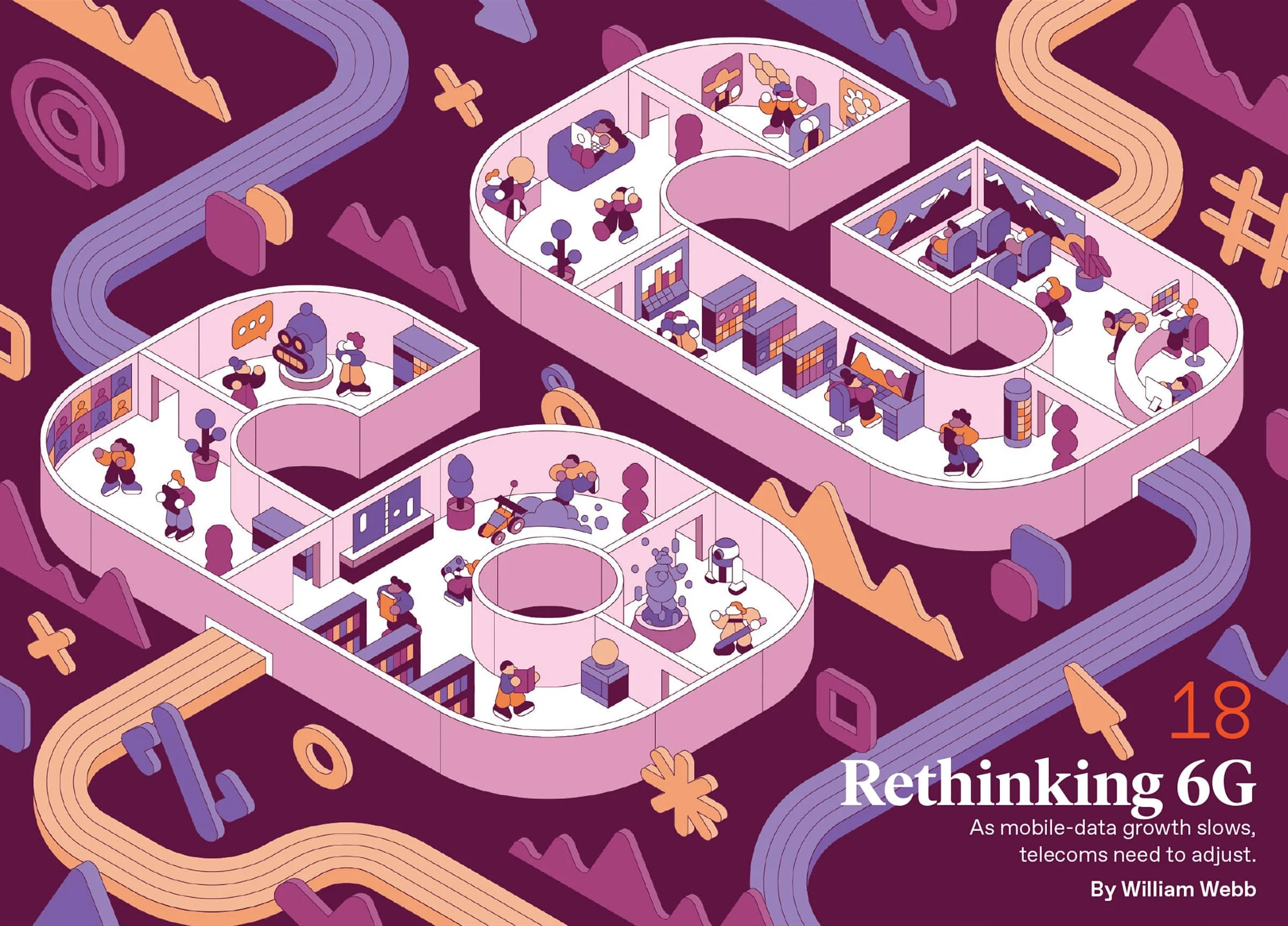 Illustration for IEEE Spectrum’s March issue feature, which explores whether slowing data growth and already-sufficient speeds signal a plateau in mobile connectivity—and challenge the urgency of next-gen network development.
