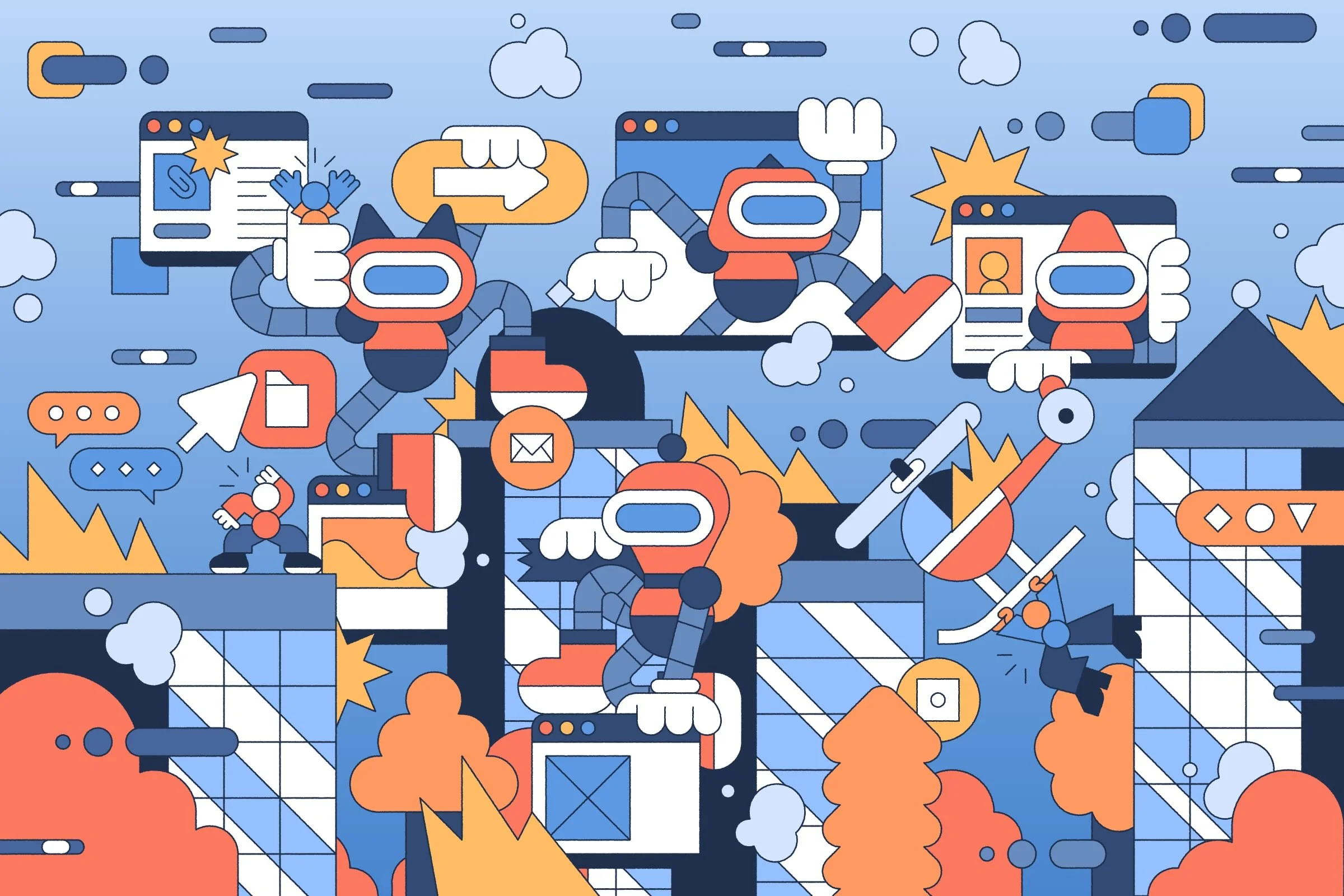 Illustration for an article on how bots challenge digital authenticity and security by mimicking users and generating content online.