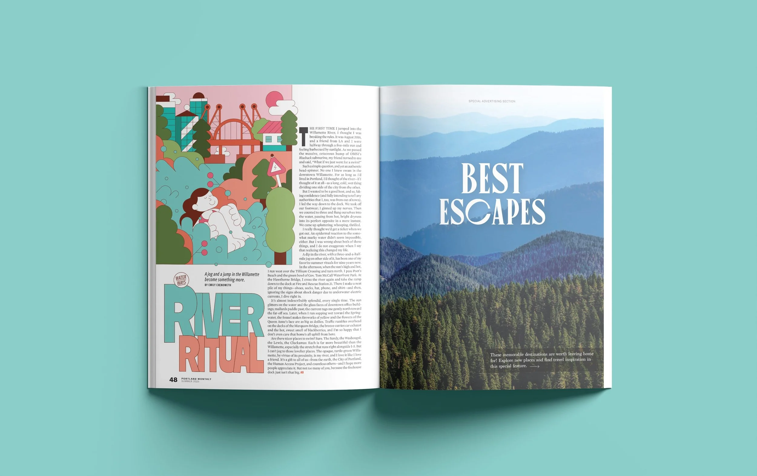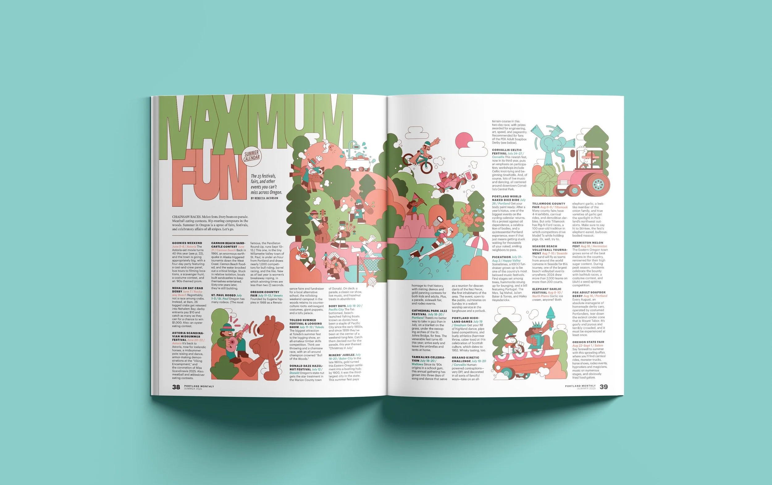 Opener and illustrations for a special feature on summer events, activities, and festivals across Oregon, published in Portland Monthly’s Summer 2025 issue.